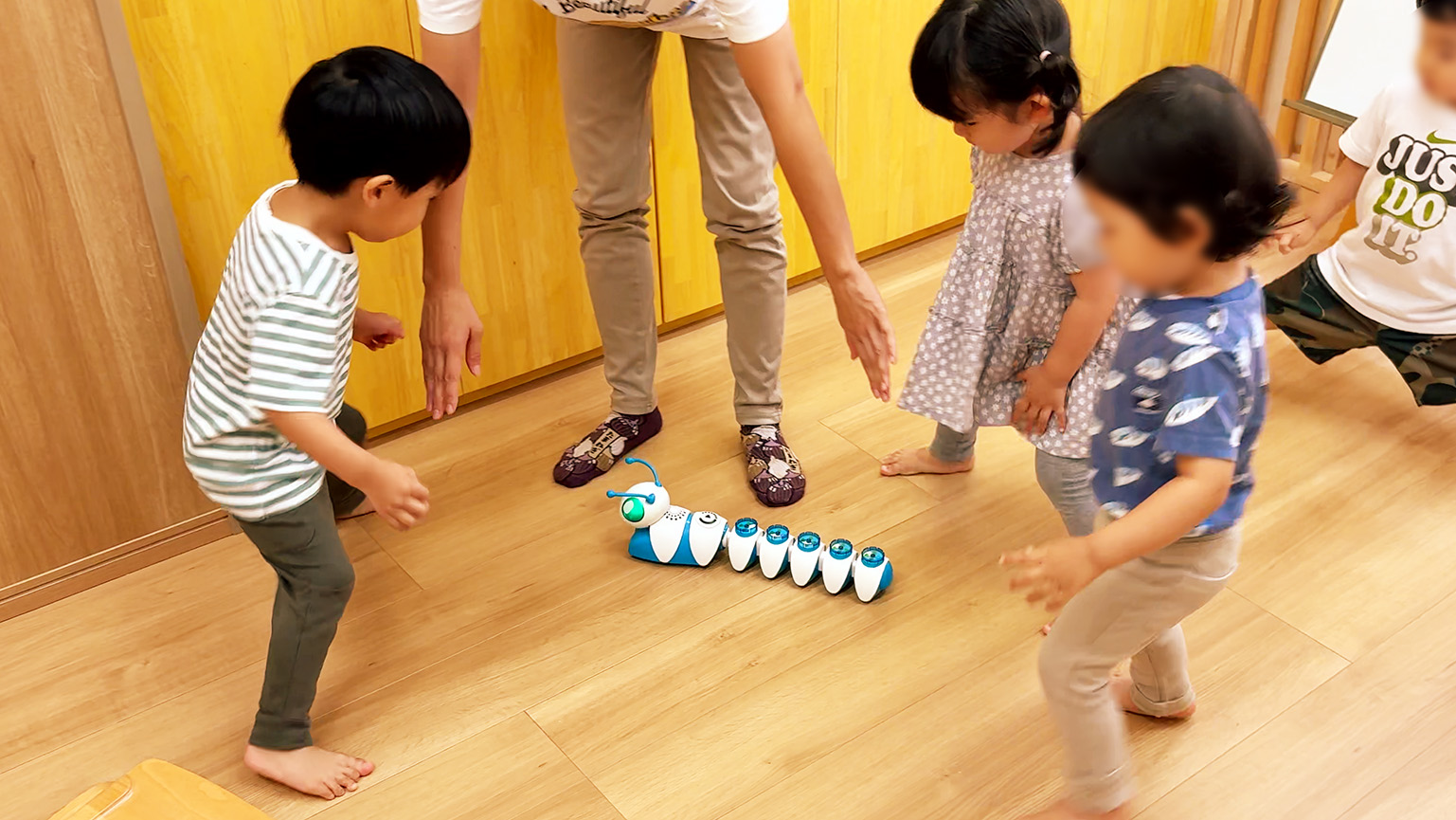 あおむし型ロボットは、文字入力を必要としないので、幼児でも簡単に、楽しく遊びながらプログラミング的思考を伸ばします。