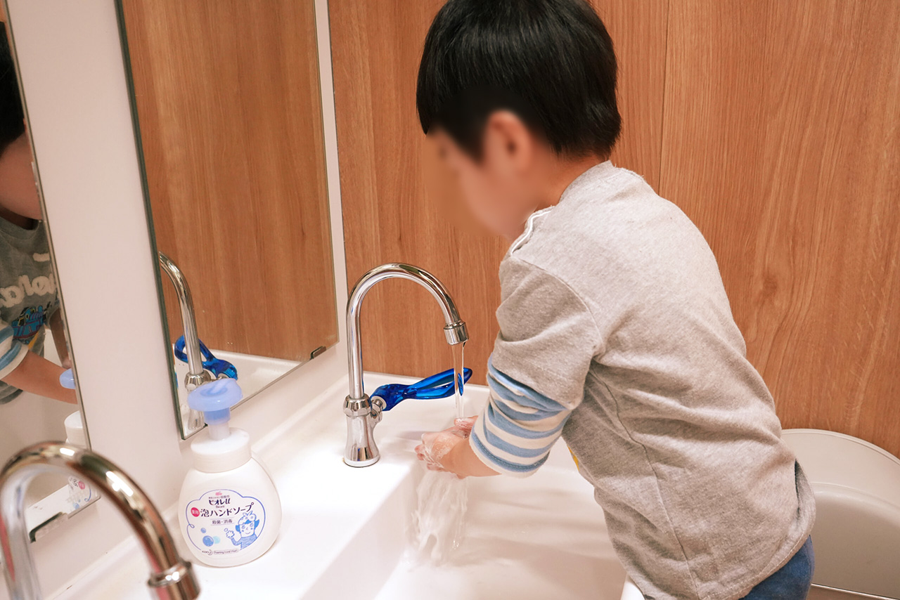 朝、元気に登園してきたこどもたちを玄関で先生が迎えます。玄関はこどもたちの声でいっぱいになります。保護者の方から、今朝の様子を伺ったりする時間でもあります。 こどもたちは園に入ると、検温、手洗い、うがいをして、朝の準備オッケーです。
