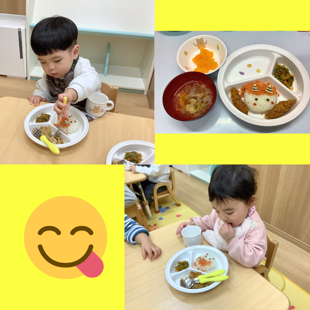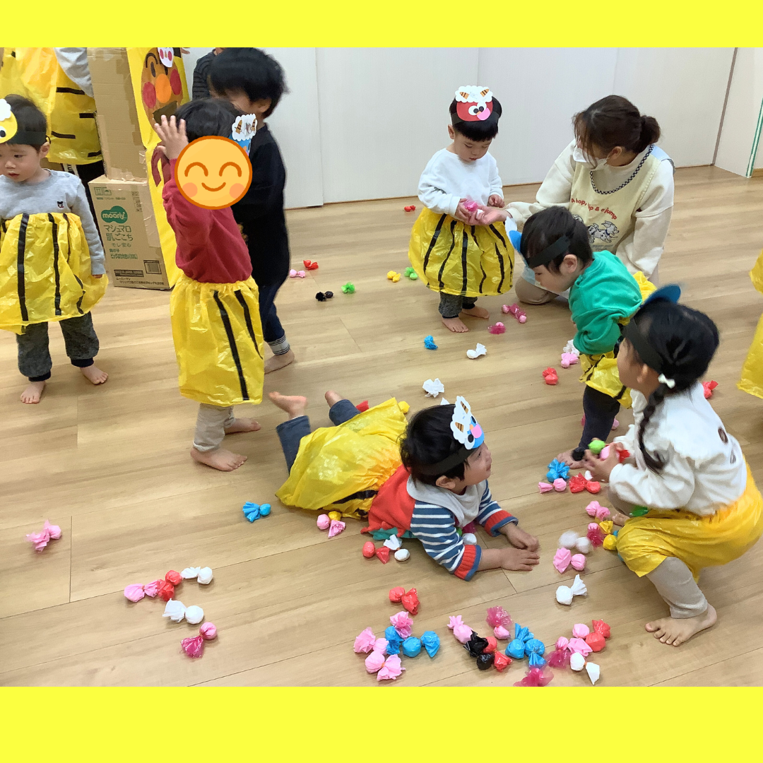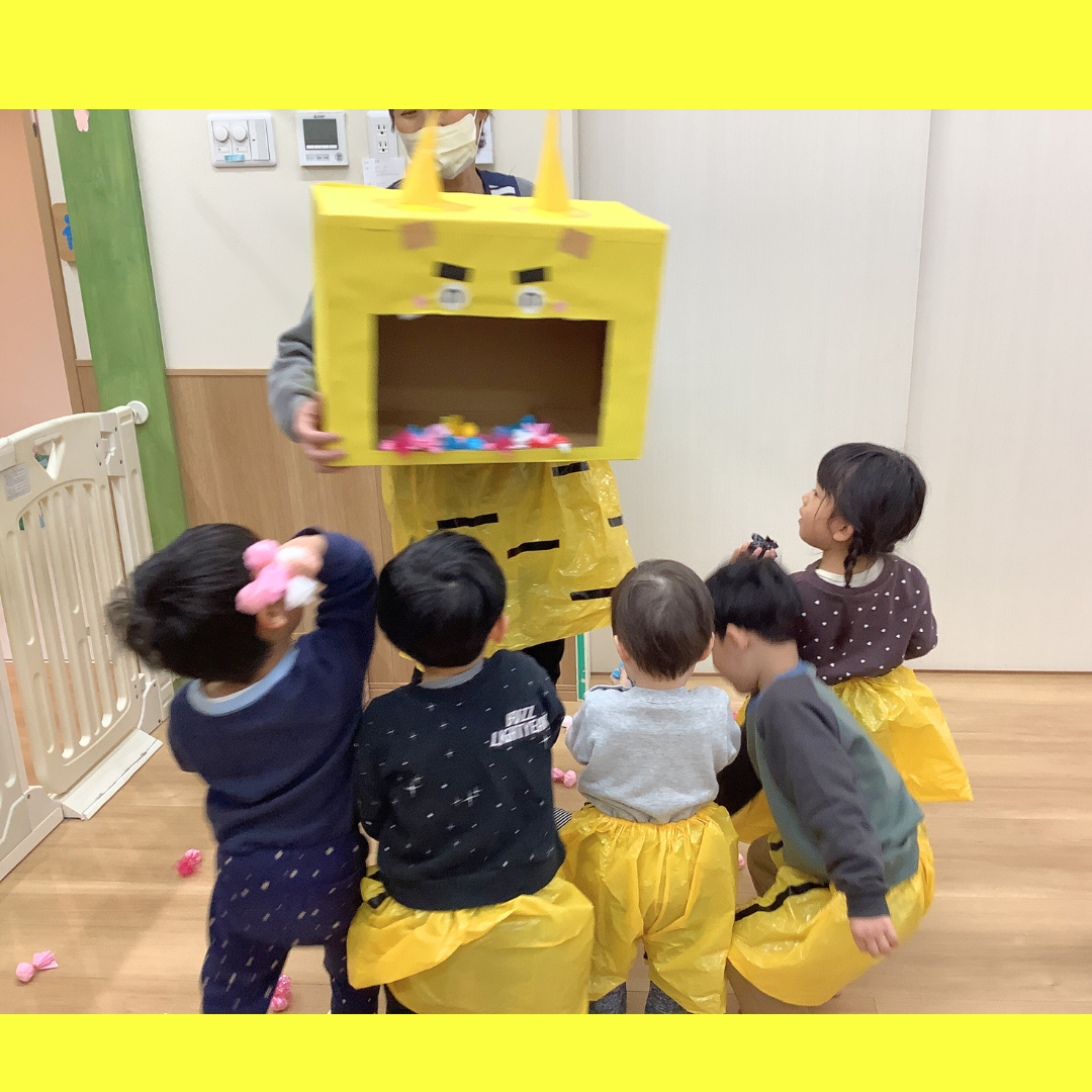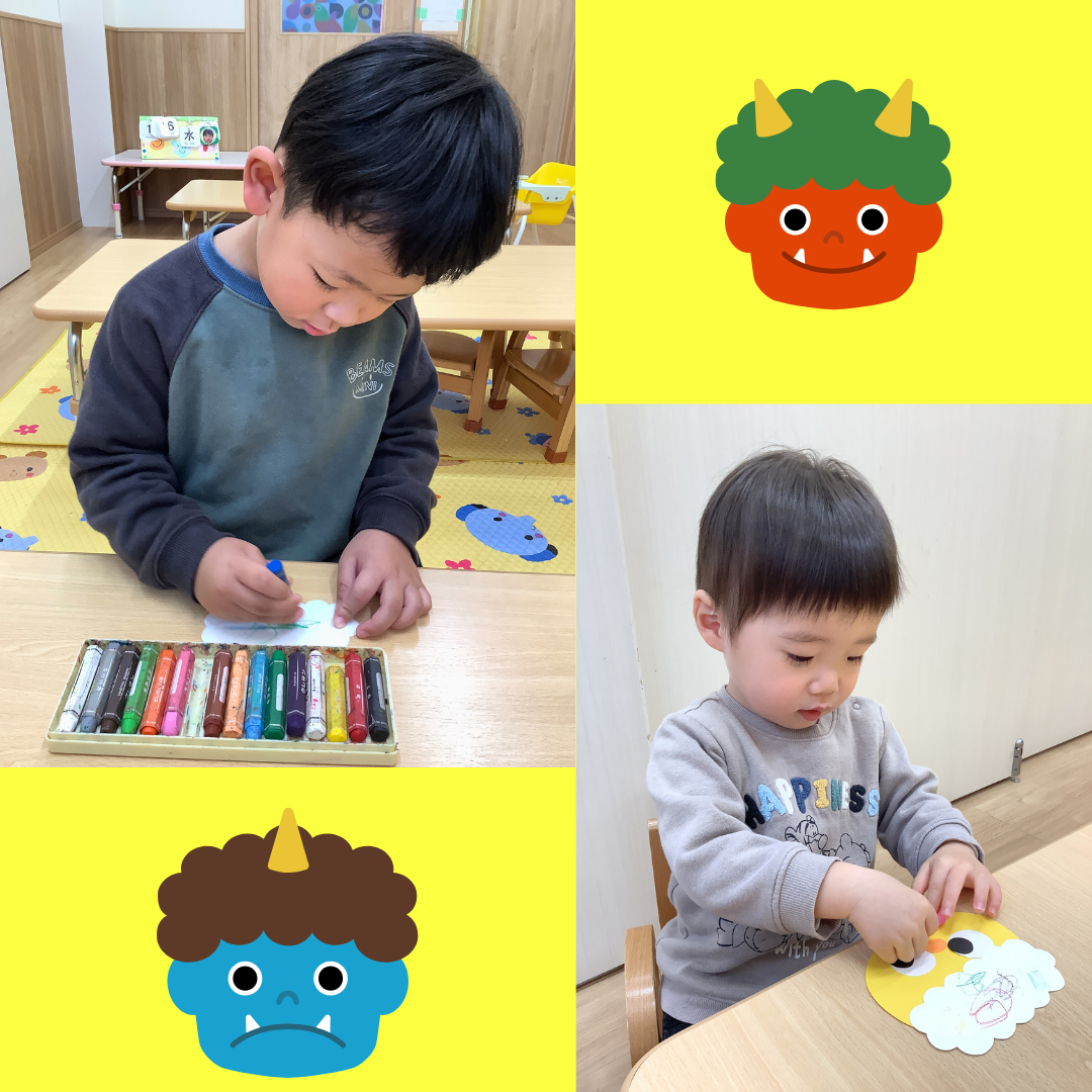 自分たちで作った鬼のお面をつけてダンスをしたり豆に見立てたキャンディを鬼やアンパンマンに食べさせてあげました😊先生の後ろにに隠れている子もいました🤣